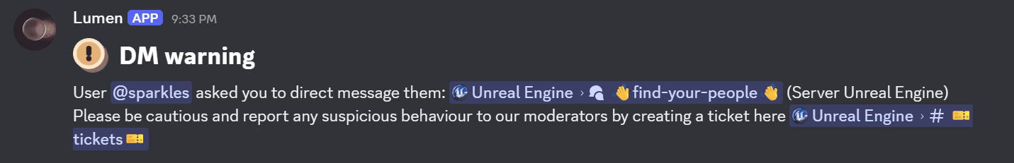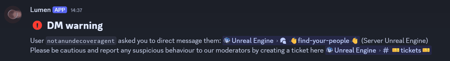 In the find-your-people forum, Lumen will send a warning DM to the post author when someone sends a message like "dm me" inside the post.